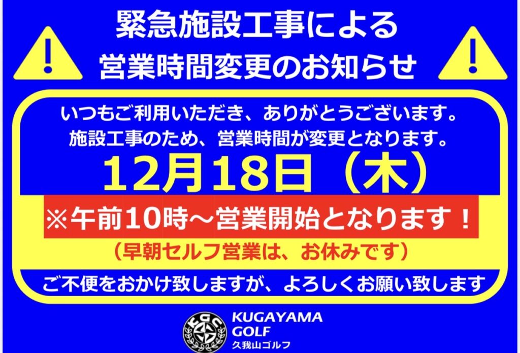 緊急工事のお知らせ 2025年12月16日 最終更新日時 : 2025年12月16日 kgc_new_kugayama 緊急工事のお知らせ 明日12/18(木)は緊急工事の為、営業開始時間がam10:00オープンとなります ご迷惑をおかけいたしますが、よろしくお願いします Screenshot Follow me!