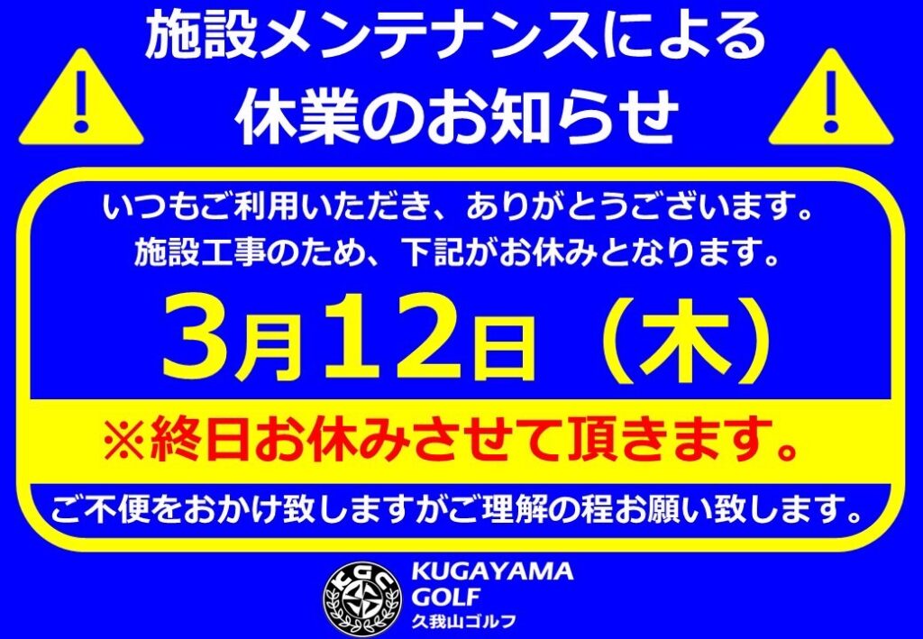 3/12(土)は施設メンテナンスの為、終日休業させて頂きます。